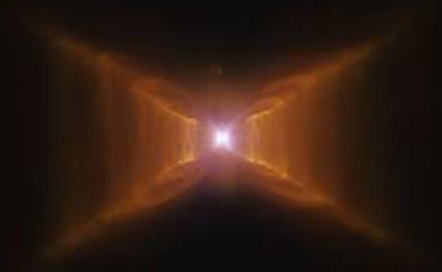 به نقل از ناسا، شکل غیرمعمول مستطیل قرمز احتمالاً به دلیل یک توده متراکم غبار است که جریان خروجی کروی را به شکل مخروطهای نوکتیز درمیآورد. از آنجا که ما توده غبار را از لبه میبینیم، لبههای مرزی مخروطها به شکل X به نظر میرسند.